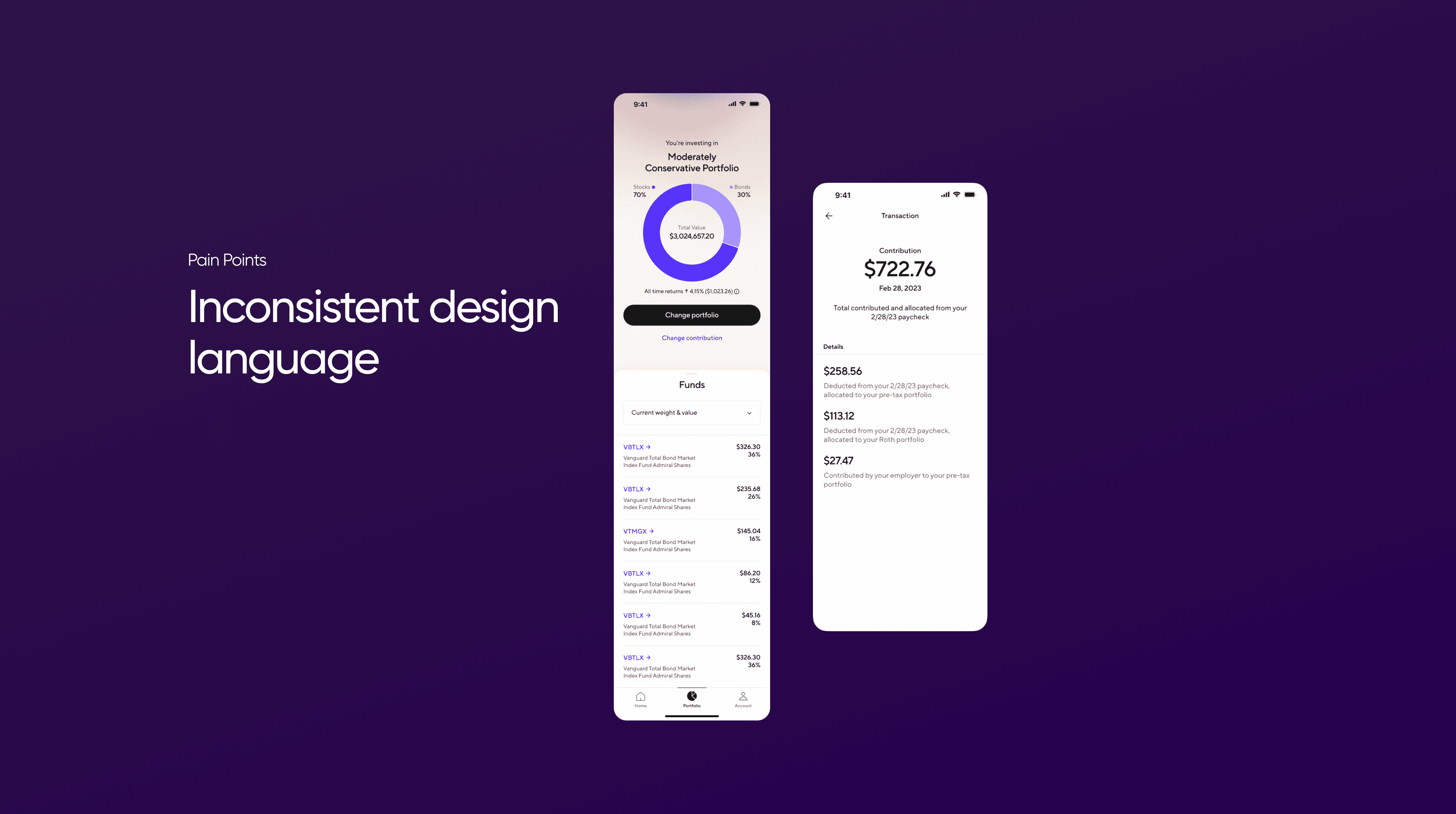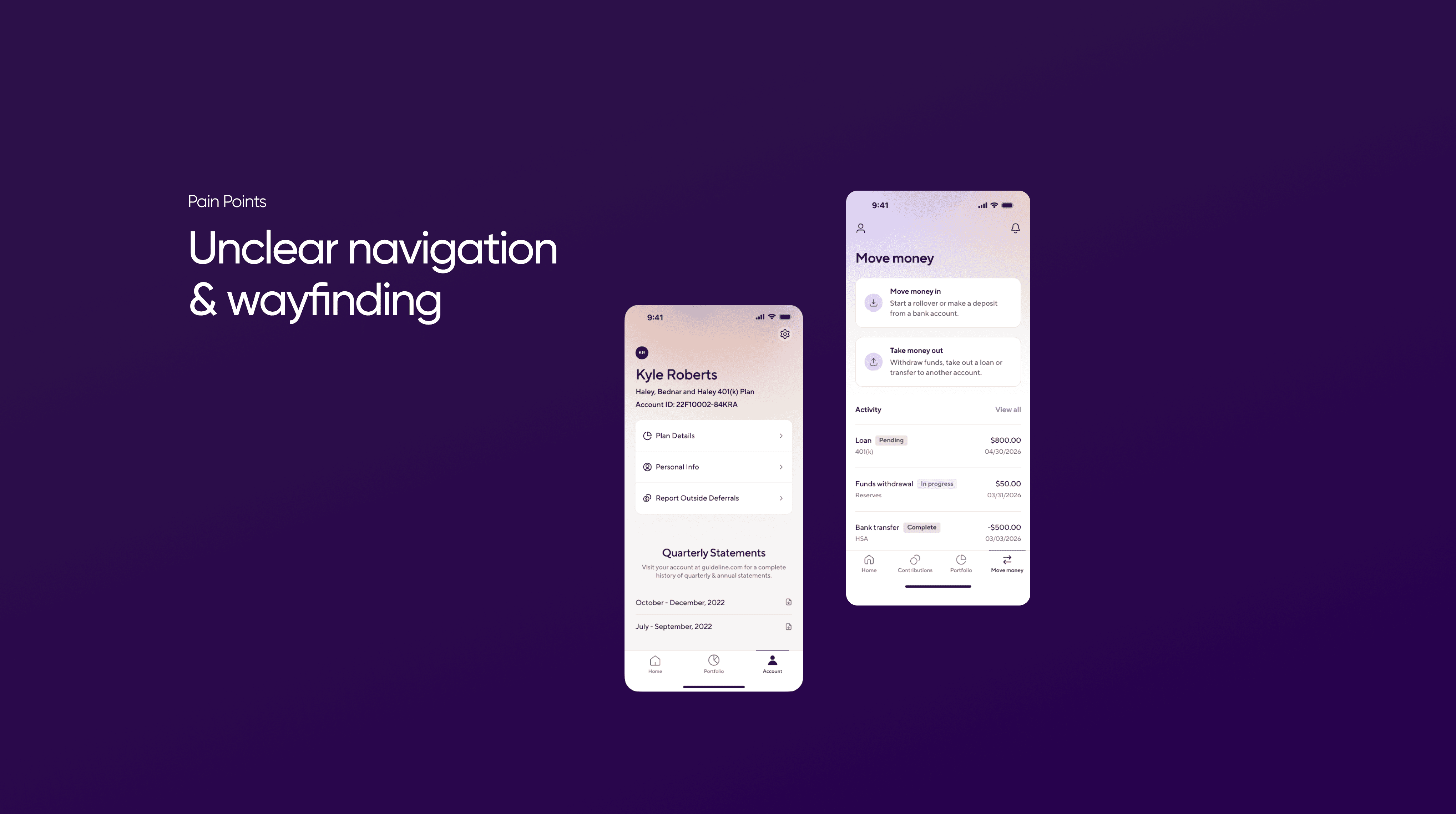 The original app felt fragmented and functionally shallow. Navigation was clunky, the experience was overly focused on 401(k)s, and key actions were buried. On top of that, with new financial tools coming online across different teams, the mobile experience risked becoming a patchwork of disconnected flows.