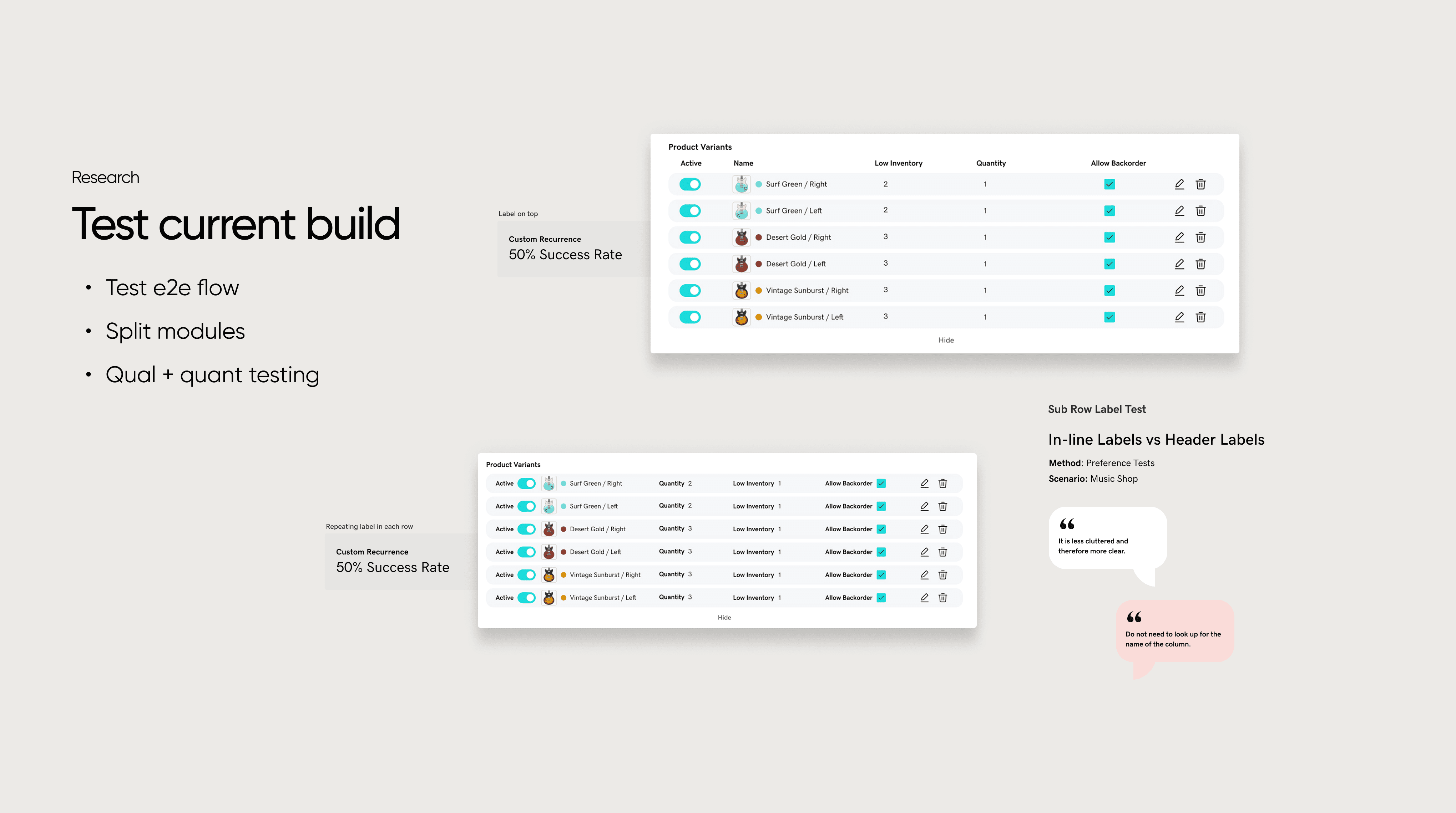 Qual + quant testing across modules validated layout changes, split flows, and guidance treatments